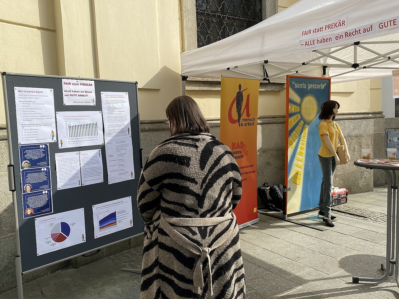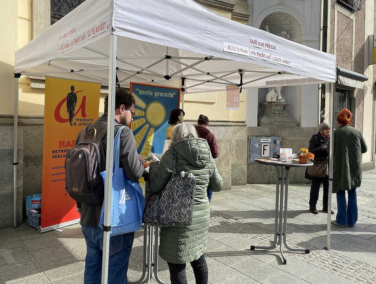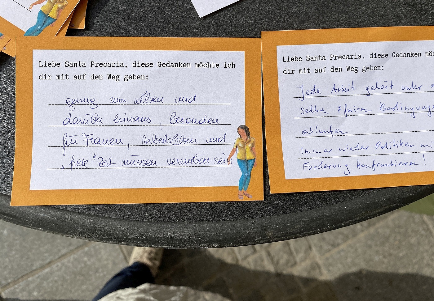 In vielen Gesprächen mit Passant:innen wurden Arbeits- und Lebensgeschichten erzählt und Erfahrungen mit prekären Arbeit-/Lebensbedingungen geteilt. Wie wichtig vor allem für Frauen eine möglichst durchgehende Erwerbstätigkeit bei existenzsicherndem Lohn ist, gerade auch im Hinblick auf die Zeit im Alter, kam mehrfach zur Sprache. Künstler:innen erzählten von ihren prekären Beschäftigungsverhältnissen. Ebenso kam zur Sprache, wie bedeutsam die Stärkung von Menschen ist, damit sie sich Rechte einfordern getrauen und dass entsprechende Rahmenbedingungen für faire Arbeit auch politisch immer wieder eingemahnt werden müssen.