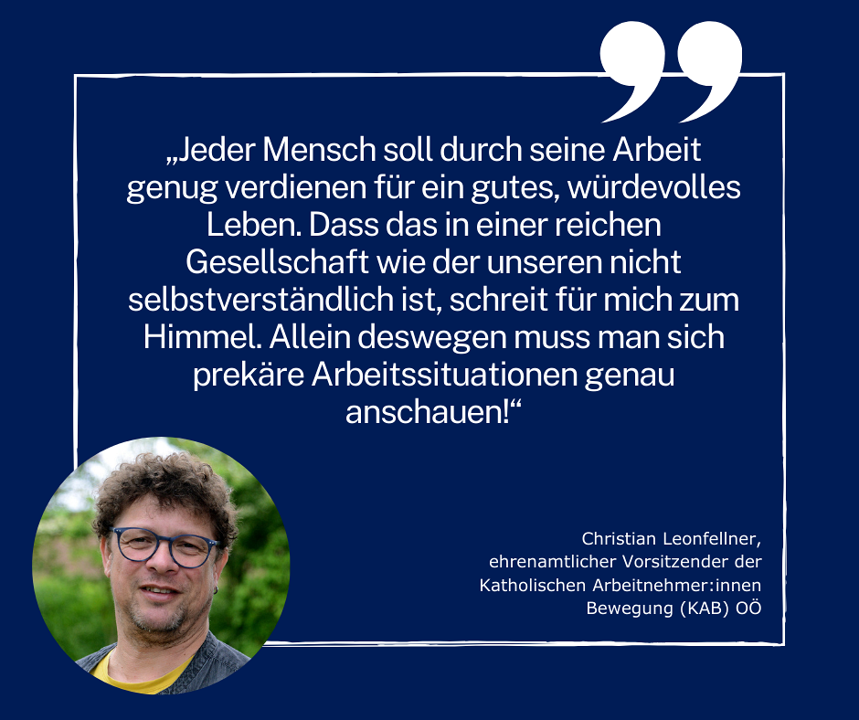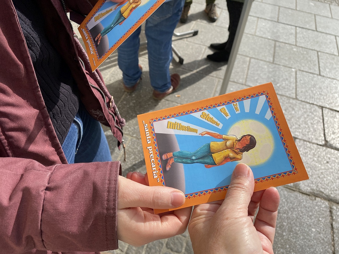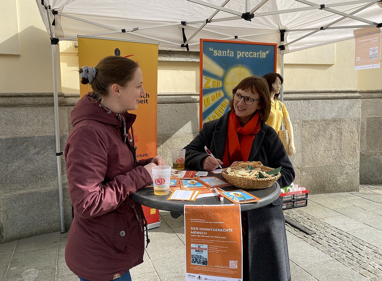 In vielen Gesprächen mit Passant:innen wurden Arbeits- und Lebensgeschichten erzählt und Erfahrungen mit prekären Arbeit-/Lebensbedingungen geteilt. Wie wichtig vor allem für Frauen eine möglichst durchgehende Erwerbstätigkeit bei existenzsicherndem Lohn ist, gerade auch im Hinblick auf die Zeit im Alter, kam mehrfach zur Sprache. Künstler:innen erzählten von ihren prekären Beschäftigungsverhältnissen. Ebenso kam zur Sprache, wie bedeutsam die Stärkung von Menschen ist, damit sie sich Rechte einfordern getrauen und dass entsprechende Rahmenbedingungen für faire Arbeit auch politisch immer wieder eingemahnt werden müssen.