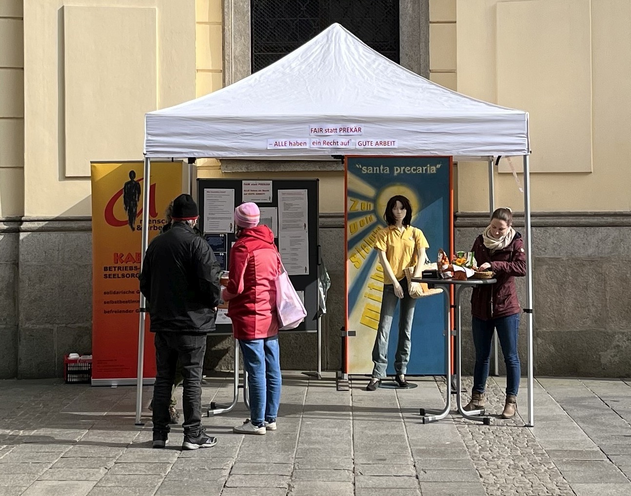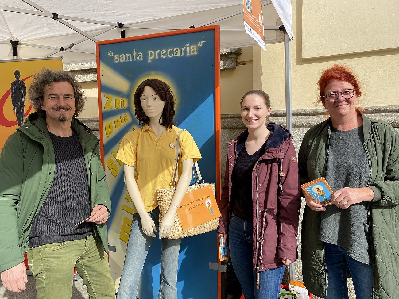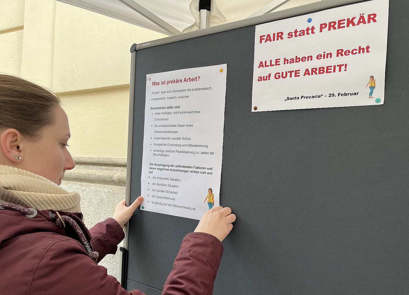 Die fiktive Schutzheilige "Santa Precaria" mit ihrem Gedenktag alle vier Jahre am 29. Februar bietet sich an, die zunehmende Prekarisierung von Arbeit in ihren vielfältigen Formen öffentlich zu thematisieren. Die Symbolfigur „Santa Precaria“ greift die christliche Tradition der Schutzheiligen auf. Sie ist eine fiktive Patronin, eine symbolische Beschützerfigur für alle Menschen, die unter prekären Arbeitsbedingungen ihren Lebensunterhalt verdienen müssen. Gleichzeitig steht sie für die vielen oft unbekannten Menschen, die sich in ihrem Lebensumfeld für eine faire Arbeitswelt einsetzen, sie steht für Widerstand gegen die derzeit vorherrschenden menschenfeindlichen Strukturen der Wirtschaft, für den Glauben, dass positive Veränderungen möglich sind und für den Mut, gute Arbeitsbedingungen für alle Menschen einzufordern.