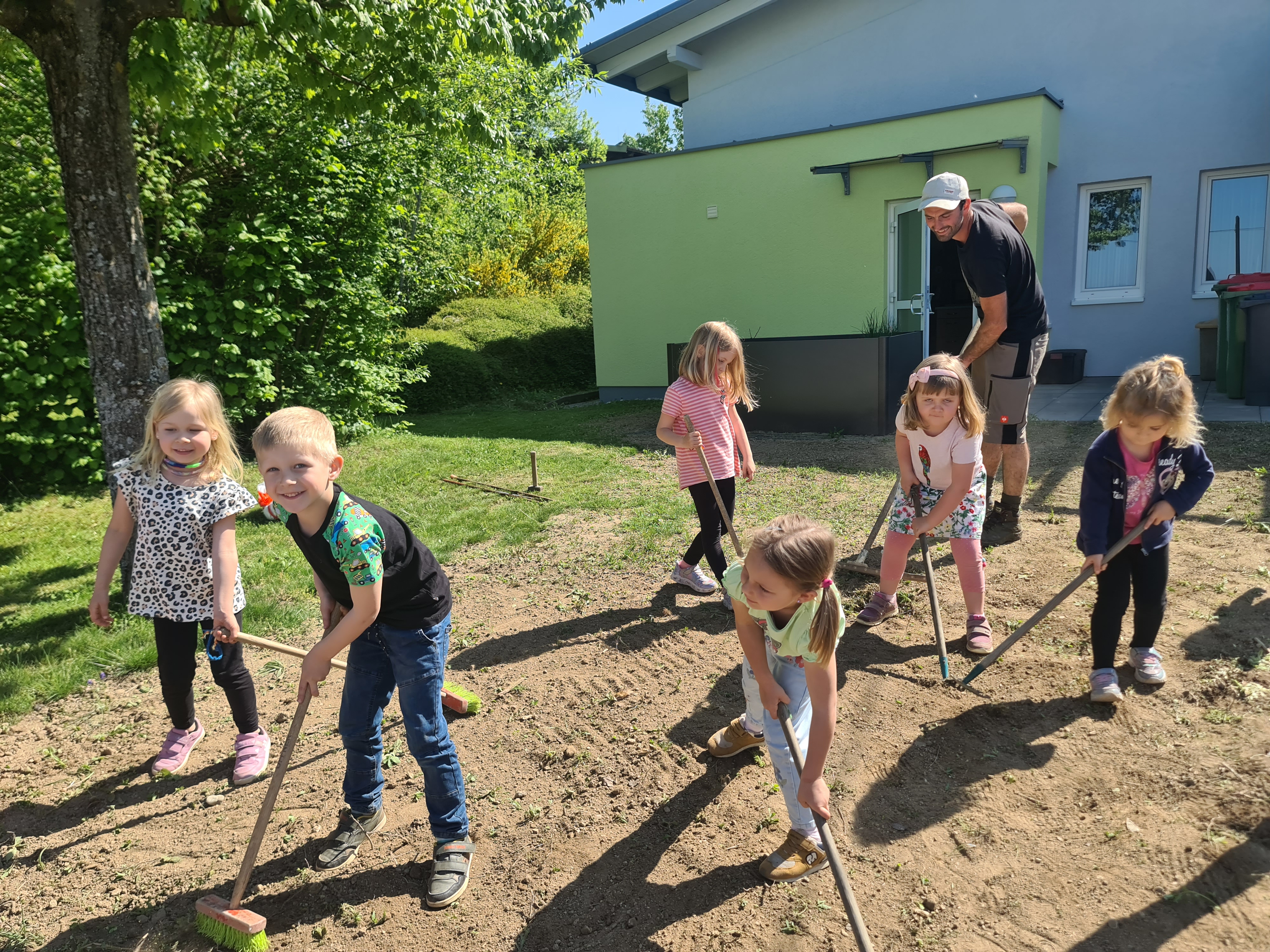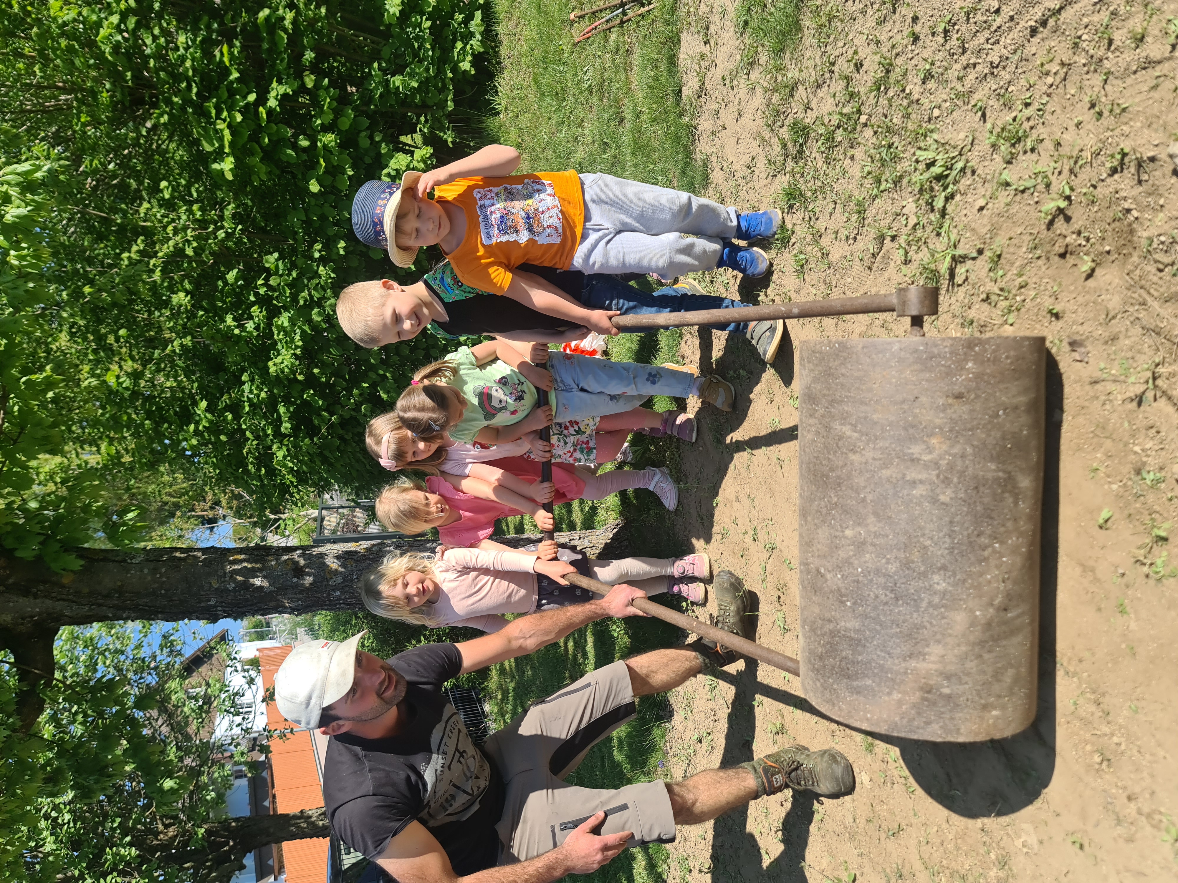 Ende April wurde unter Anleitung von Gemeindearbeiter Thomas Oberpeilsteiner eine kleine Fläche als Blumenwiese angelegt. Thomas hat die Kinder in alle notwendigen Arbeitsschritte aktiv eingebunden. Es gab einiges zu tun: Die Fläche wurde zuerst von Steinen und Unkraut befreit- das Saatgut ausgestreut – und mit vereinten Kräften die Walze zur Verdichtung eingesetzt. Letzteres hat den Kindern so richtig Spaß gemacht. Sie waren begeistert und unglaublich fleißig.