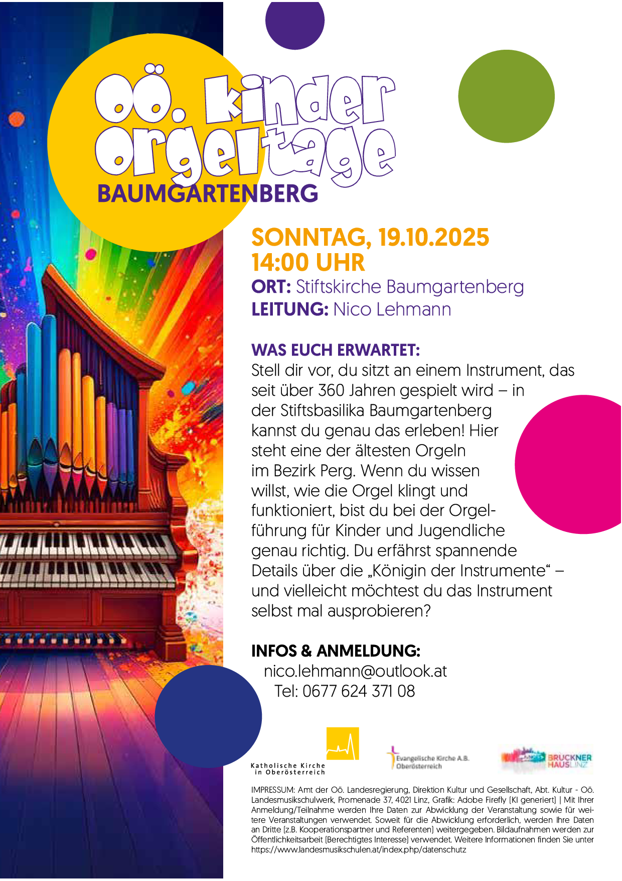 Am Freitag, 17. Oktober 2025 um 15:30 steht die Hl.-Geist-Orgel in der Pfarrkirche Ried in der Riedmark im Mittelpunkt, gefolgt von der Orgel der Stiftsbasilika Baumgartenberg am Sonntag, 19. Oktober 2025 um 14:00. Um teilnehmen zu können, ist eine Anmeldung per Mail notwendig. Weitere Informationen entnehmen Sie bitte den Flyern zu den Kinderorgeltagen