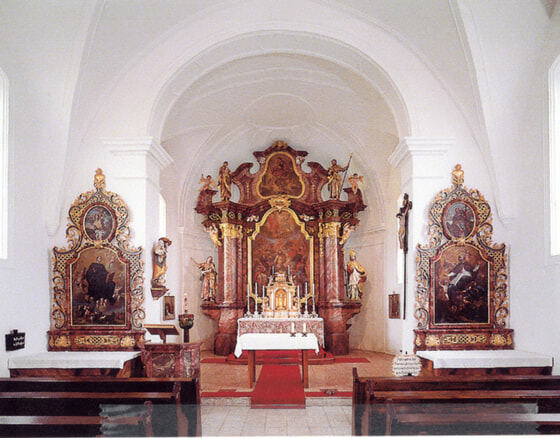 Im Inneren sind drei Altäre; der Hauptaltar mit dem Bilde des Hl. Vitus;" die beiden Seitenaltäre mit kunstvollen Bilderrahmen, und schön gemalten Altarbildern. Auf der Evangelienseite der Hl. Leonhard, auf der Epistelseite der Hl. Johannes v. Nepomuk. Man sagt, es sei in alter Zeit eine Kapelle zur Hl. Barbara in Wilhelmsberg, hiesiger Pfarre, gestanden; diese Kapelle sei abgetragen und das noch gebrauchsfähige Materiale zum Bau des Kirchleins in "St. Veit" verwendet worden. Auch die beiden Glocken sollen von genannter Barbara - Kapelle nach St. Veit gebracht worden sein.