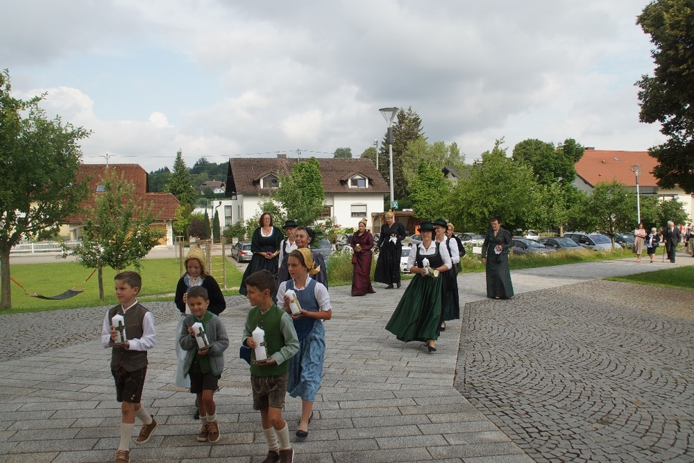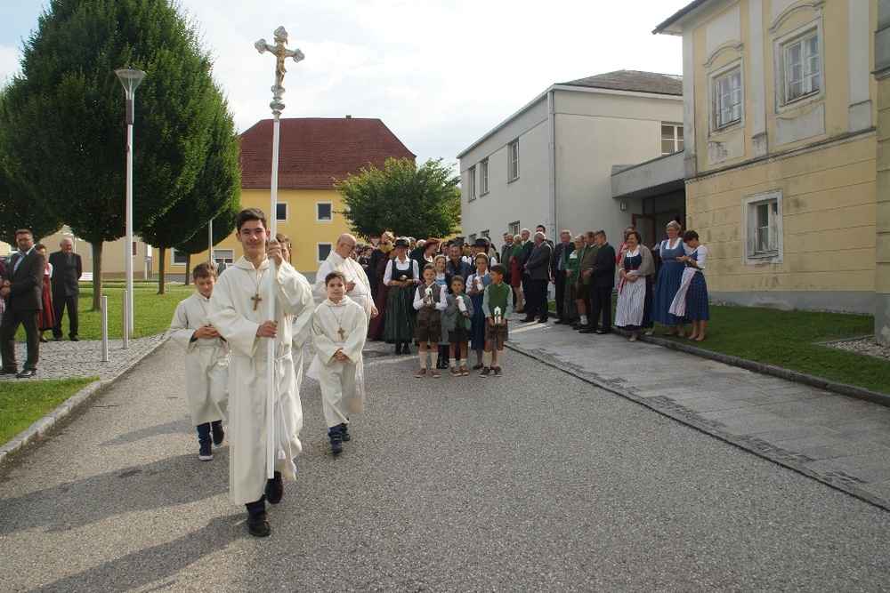 Mit Goldhaubenobfrau-Stellv. Elfi Thurner und Birgit Lindinger; Pfarrer Mag. Josef Etzlstorfer sowie Goldhaubenobfrau Sieglinde Eisenhuber