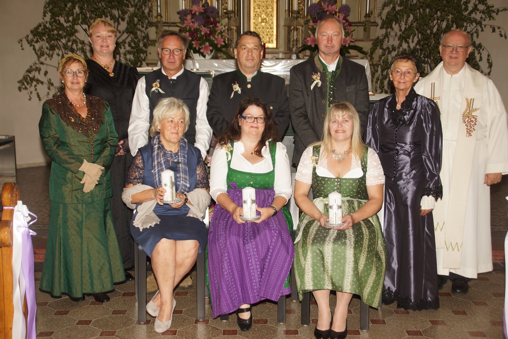 Die Silberhochzeit feierten Margit und Hubert Doppler. Elisabeth und Christian Forstner, Gerlinde und Christian Mair sowie Goldhaubenobfrau-Stellv. Elfi Thurner und Birgit Lindinger; Goldhaubenobfrau Sieglinde Eisenhuber sowie Pfarrer Mag. Josef Etzlstorfer.